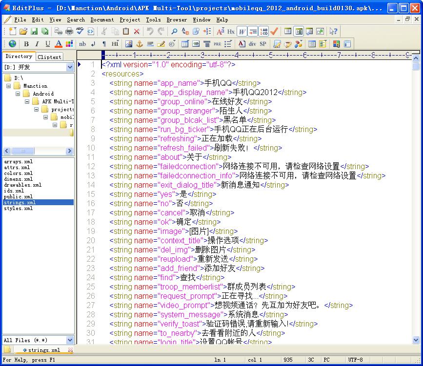 (4) 我们对project文件夹中的文件进行编辑,一般APK的图片文件放在XXX.apk\res\drawable-hdpi文件夹里面,我们可以通过Photoshop等图像处理软件对其中的图片包括软件的图标进行编辑替换;而APK的语言文件一般是在XXX.apk\res\values文件夹的strings.xml文件里面,我们可以使用EditPlus等文字编辑工具对里面的文字进行编辑;